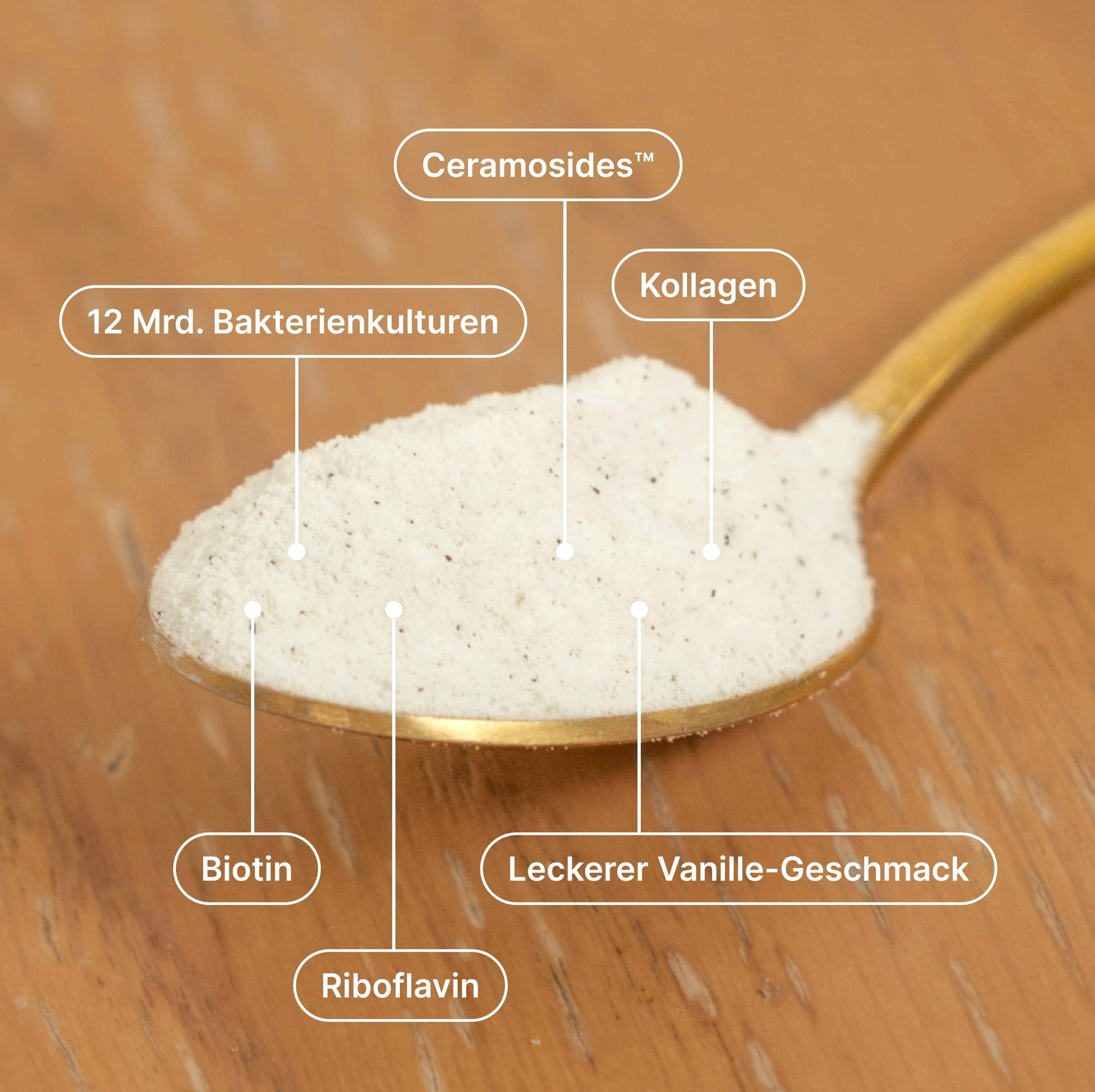 83 % Rinder-Kollagenhydrolysat, Resistentes Dextrin, Akazienfaser, natürliches Aroma, 1 % Bourbon-Vanille, Bakterienmischung (Lactobacillus brevis, Lactobacillus bulgaricus, Lactobacillus casei, Lactobacillus paracasei, Bifidobacterium Longum, Bifidobacterium Infantis, Bifidobacterium lactis, Bifidobacterium Breve, Lactobacillus rhamnosus, Lactobacillus acidophilus, Bifidobacterium Bifidum, Lactobacillus plantarum), Süßungsmittel (Steviolglycoside aus Stevia), Ceramosides™ (Weizen-Extrakt), Riboflavin, Vitamin B6, Thiamin (Vitamin B1), Biotin, Vitamin B12