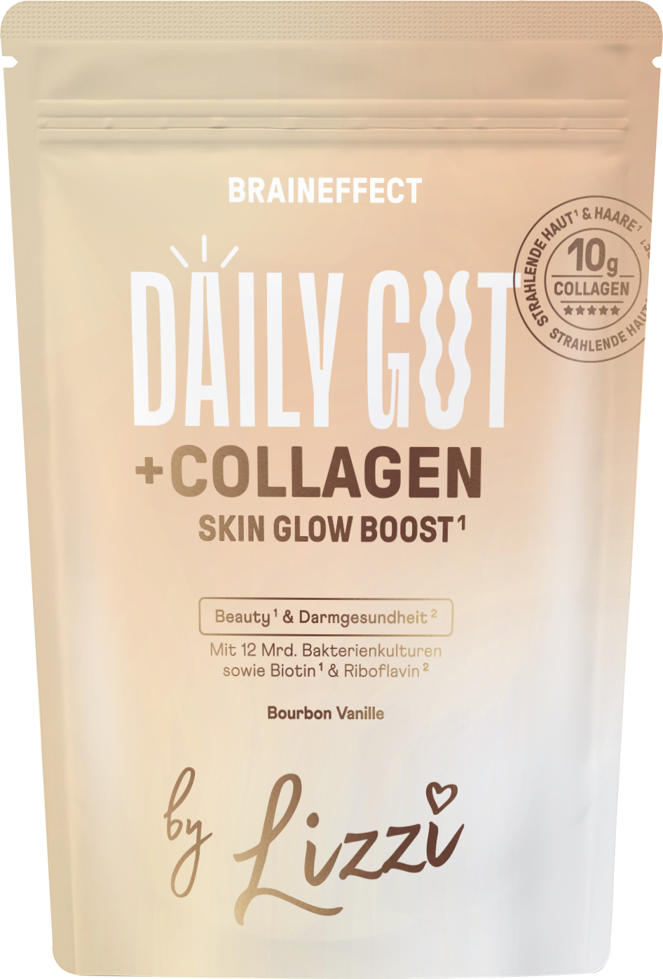 Das Daily Gut+ Kollagen Pulver von BRAINEFFECT enthält 12 Milliarden lebende Bakterienkulturen. Diese kommen auch natürlich in deinem Darm vor. Außerdem enthält das Pulver 10g des Strukturproteins Kollagen, das unter anderem essenziell für deine Haut ist. Obendrauf wird das DAILY GUT + KOLLAGEN durch Ceramide, Biotin und Riboflavin ergänzt.