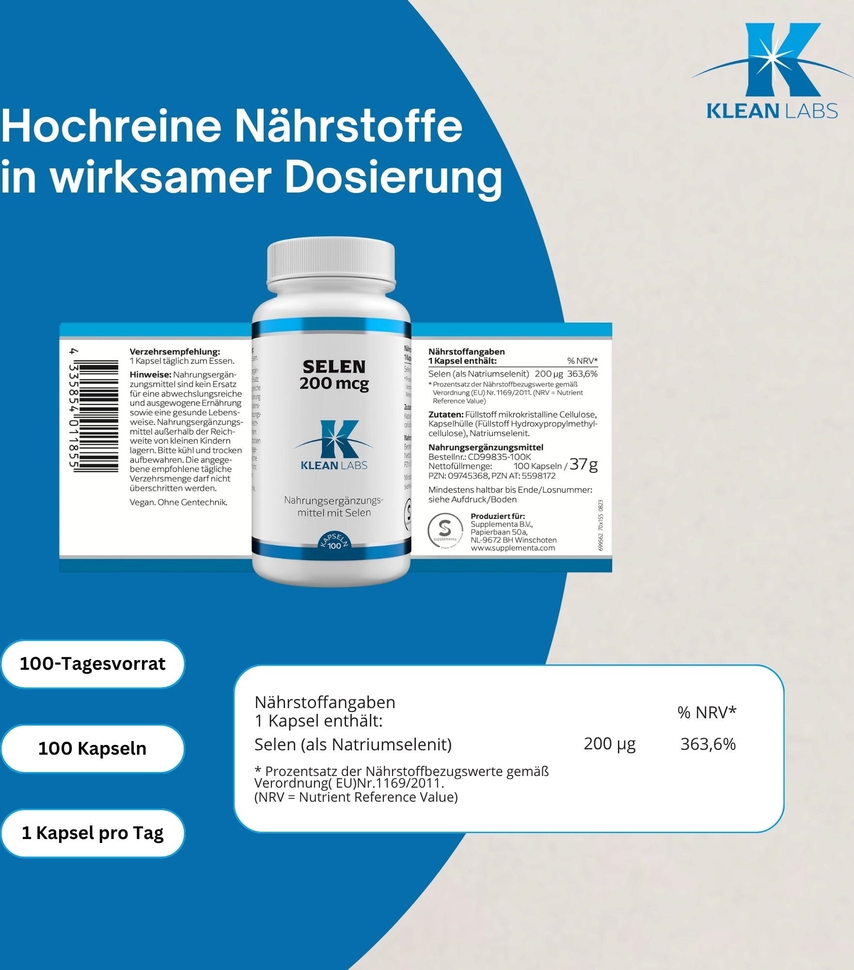 | Verantwortliches Lebensmittelunternehmen: | Supplementa Corporation B.V., Papierbaan 50a, 9672 BH, Winschoten, Niederlande, info@supplementa.com |
