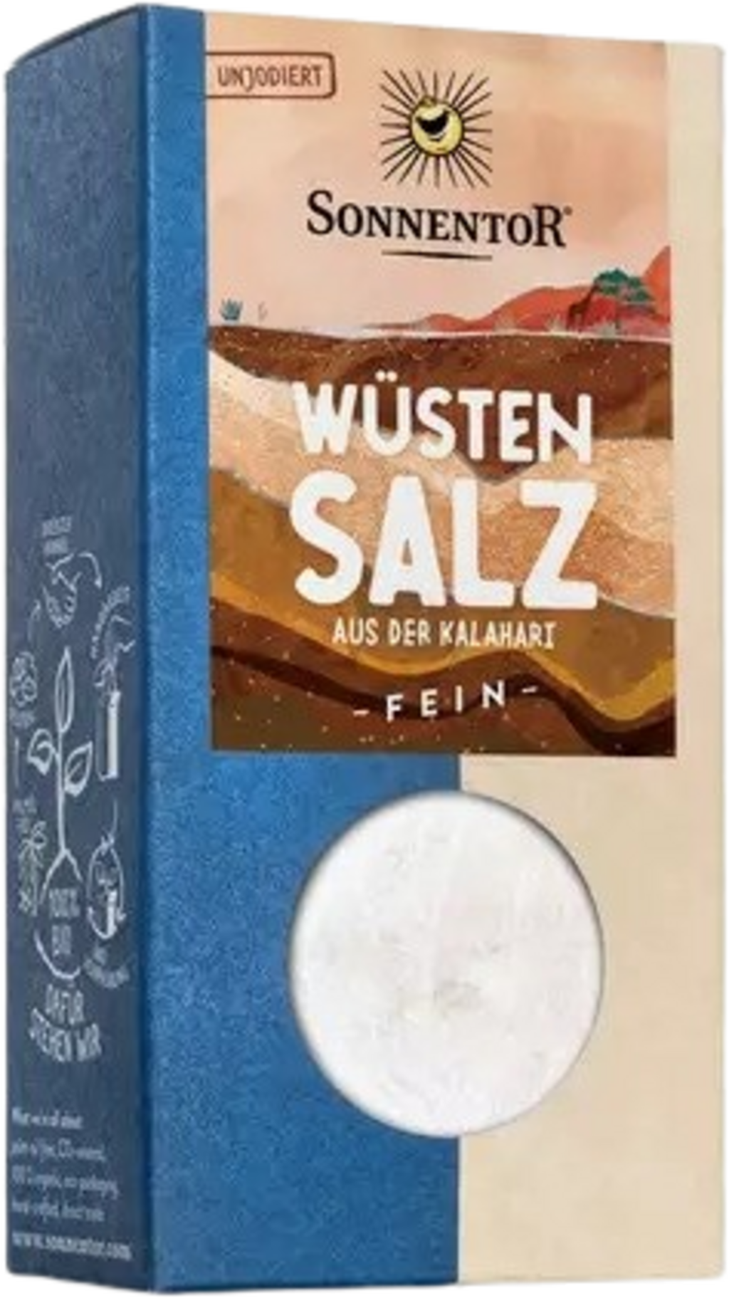 Wüstensalz gilt als Gourmet-Salz und ist gleichzeitig eines der ältesten dieser Welt. Es wird händisch aus unterirdischen Solen, zum Teil sind diese 280 Millionen Jahre alt, gelöst. Dieses Salz wird in der südafrikanischen Kalahari-Wüste gewonnen, im Anschluss in der Sonne getrocknet und abgepackt. Es enthält viele Mineralien und Spurenelemente, besitzt eine ausgeprägte Würzkraft und zählt unter den Starköchen als erste Wahl.
