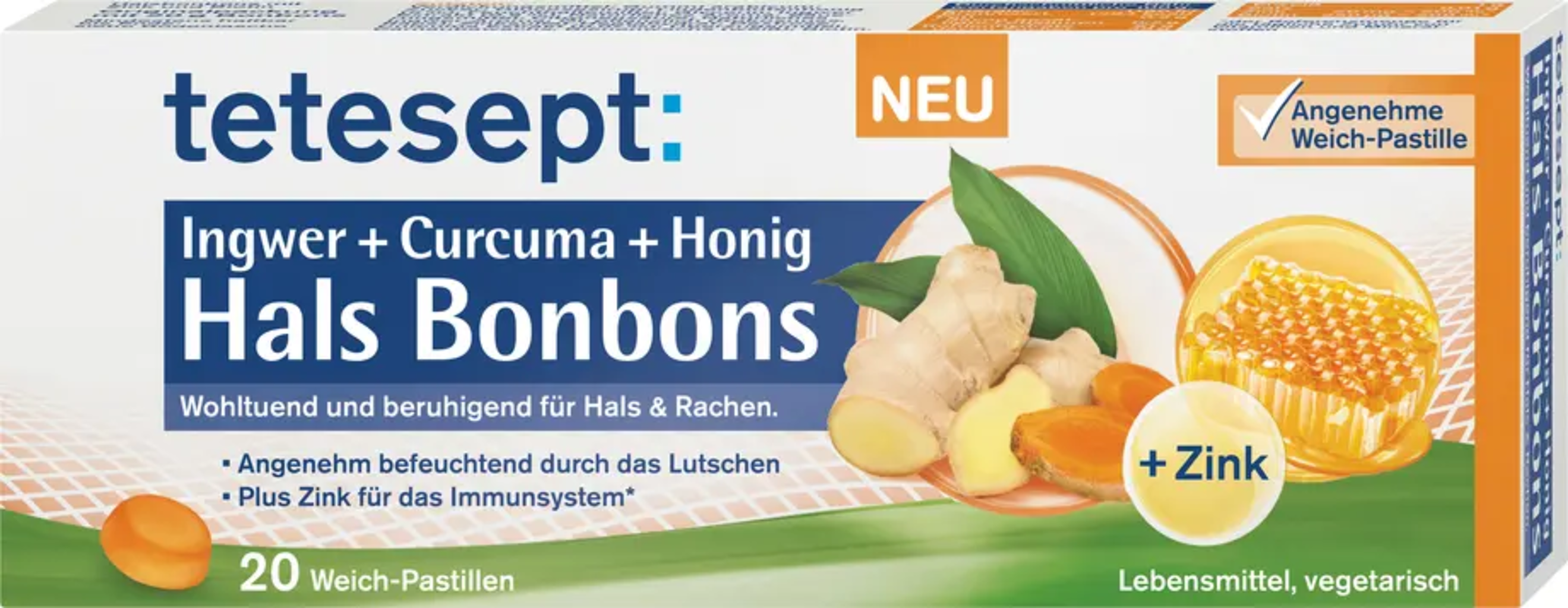 Die Ingwer + Curcuma + Honig Hals-Bonbons von tetesept sind mit Lindenblütenhonig und den natürlichen Extrakten aus Kurkuma und Ingwer angereichert. Zusätzlich enthalten die Bonbons wertvolles Zink. Ihr angenehmer Geschmack macht die Einnahme besonders komfortabel. Die Rezeptur der Bonbons ist frei von Gluten und Laktose.