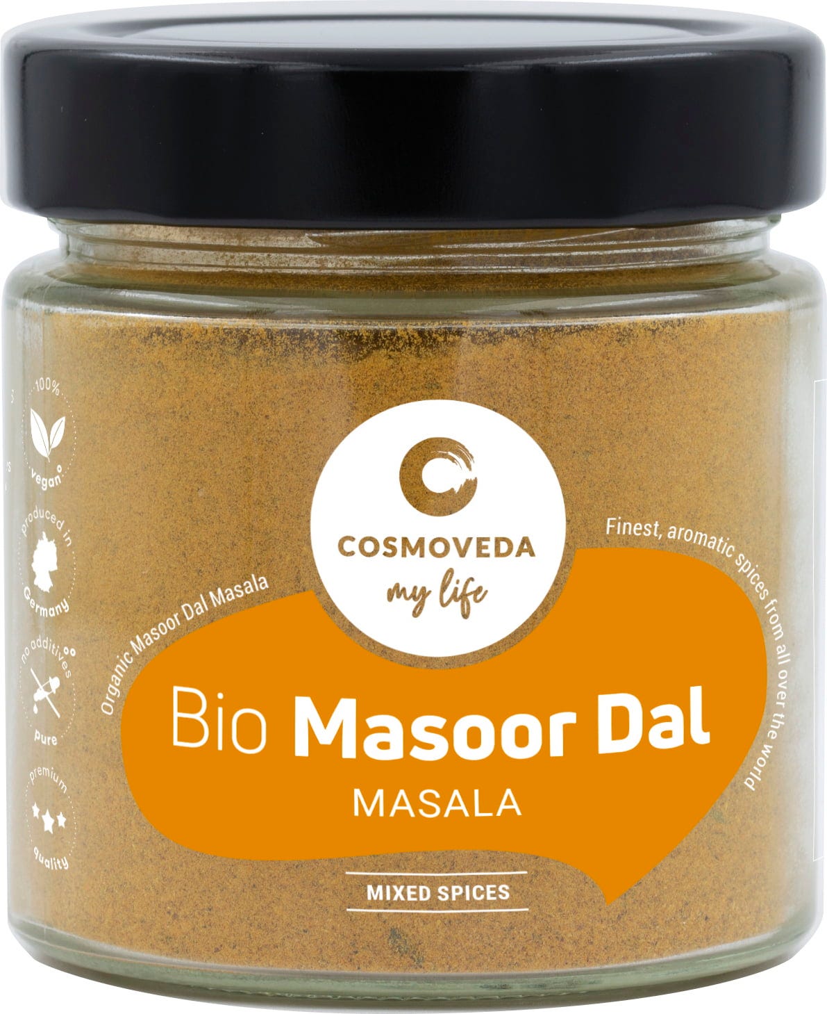 COSMOVEDA Organic Masoor Dal Masala, a specially formulated Ayurvedic blend of fine spicesfor simply delicious and easily digestible Masoor Dal.