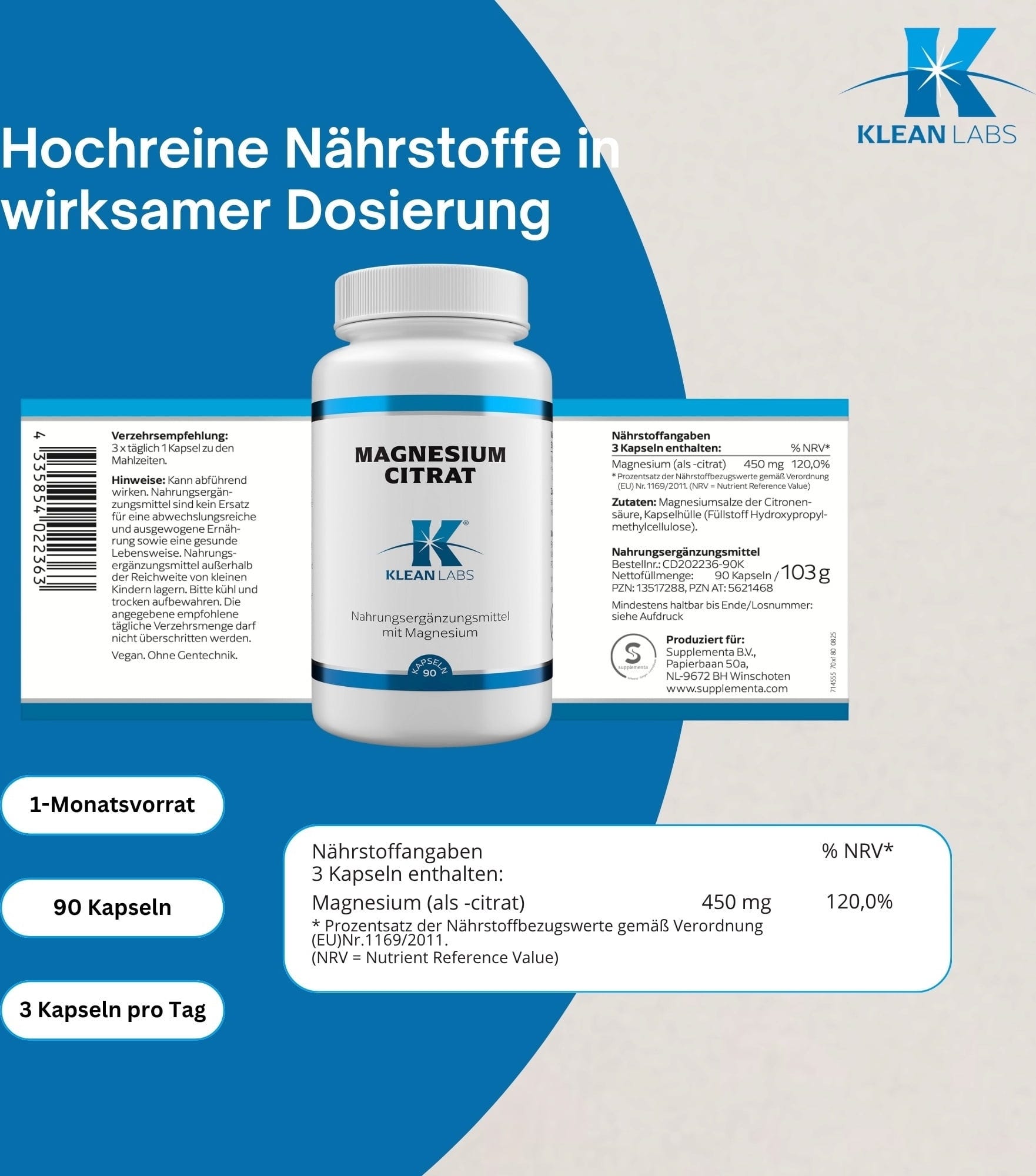 | Responsible food business operator: | Supplementa Corporation B.V., Papierbaan 50a, 9672 BH, Winschoten, Netherlands, info@supplementa.com |