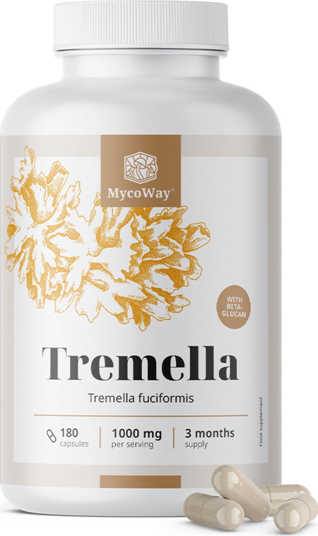 MycoWay's Tremella capsules contain gently dried and finely ground Tremella mushrooms. This mushroom is found growing in tropical and subtropical regions. It is often used in skin and hair care cosmetics products due to its moisturising properties. The mushroom is also rich in beta-glucan.