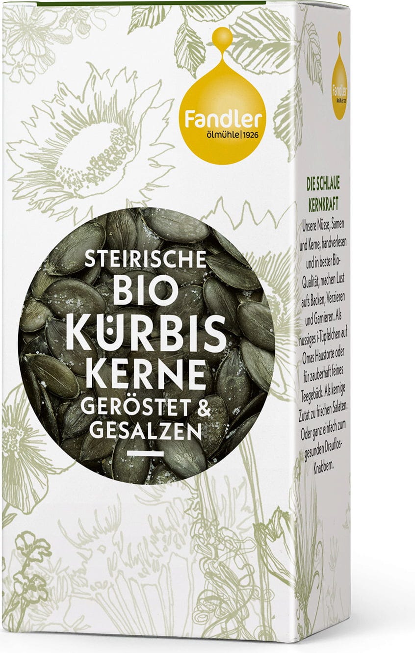 Fandler's roasted and salted organic pumpkin seeds from Styria are perfect as a snack. They also add a wonderful flavour to salads, soups, casseroles, spreads and more. A delicious addition to every kitchen pantry!