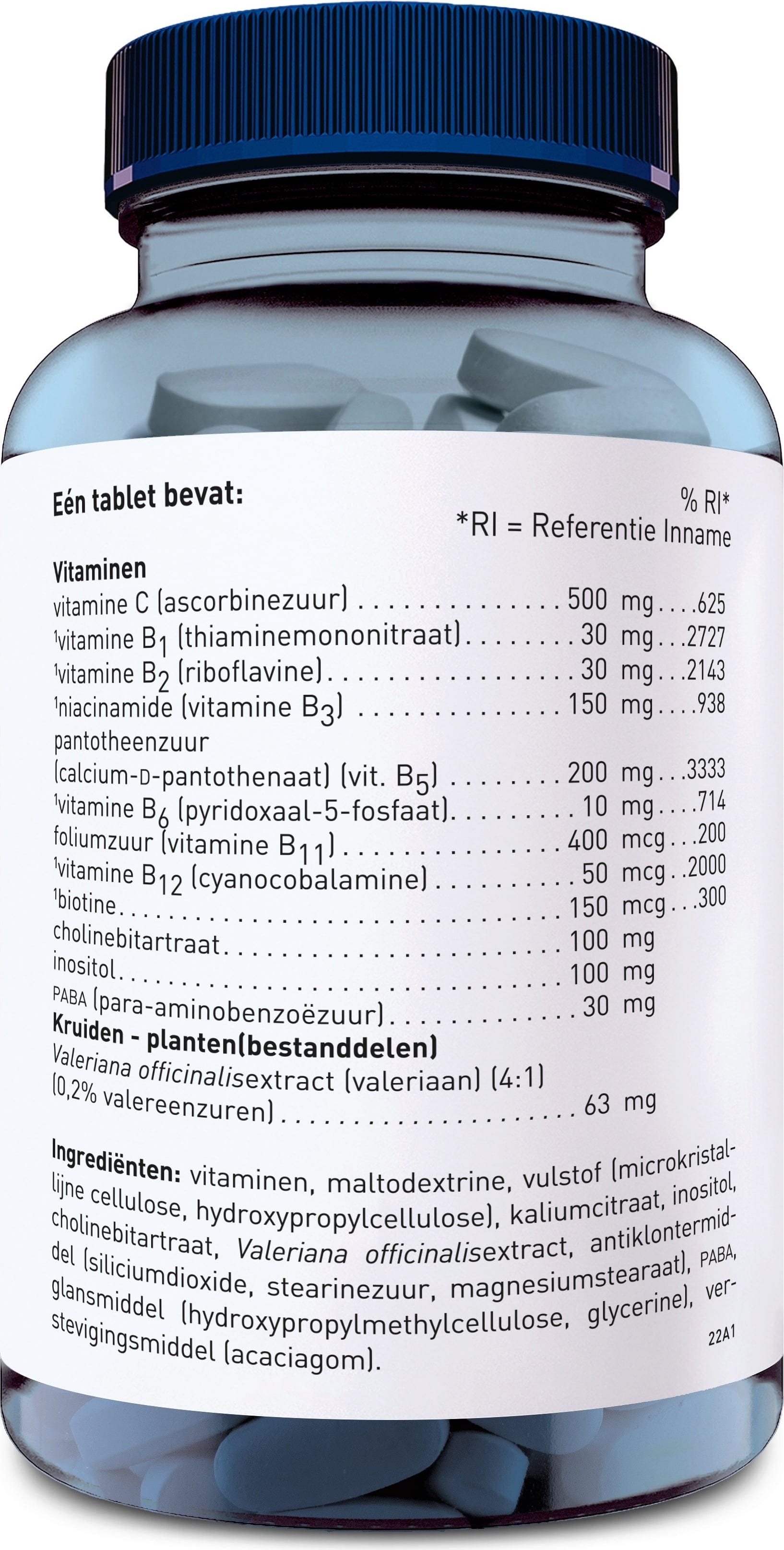 L-ascorbic acid, Maltodextrin, Vitamin B5 (Calcium Pantothenate), Filler (Microcrystalline cellulose, Hydroxypropyl cellulose), Niacinamide, Potassium citrate, Inositol, Choline bitartrate, Valerian extract, PABA (para-aminobenzoic acid), Riboflavin, Thiamine mononitrate, Release Agent (Silicon dioxide, Fatty acids, Magnesium salts of fatty acids), Coating (Hydroxypropyl methylcellulose, Glycerine), Pyridoxine hydrochloride, Firming agent (Gum arabic), Folic acid, Biotin, Cyanocobalamin
