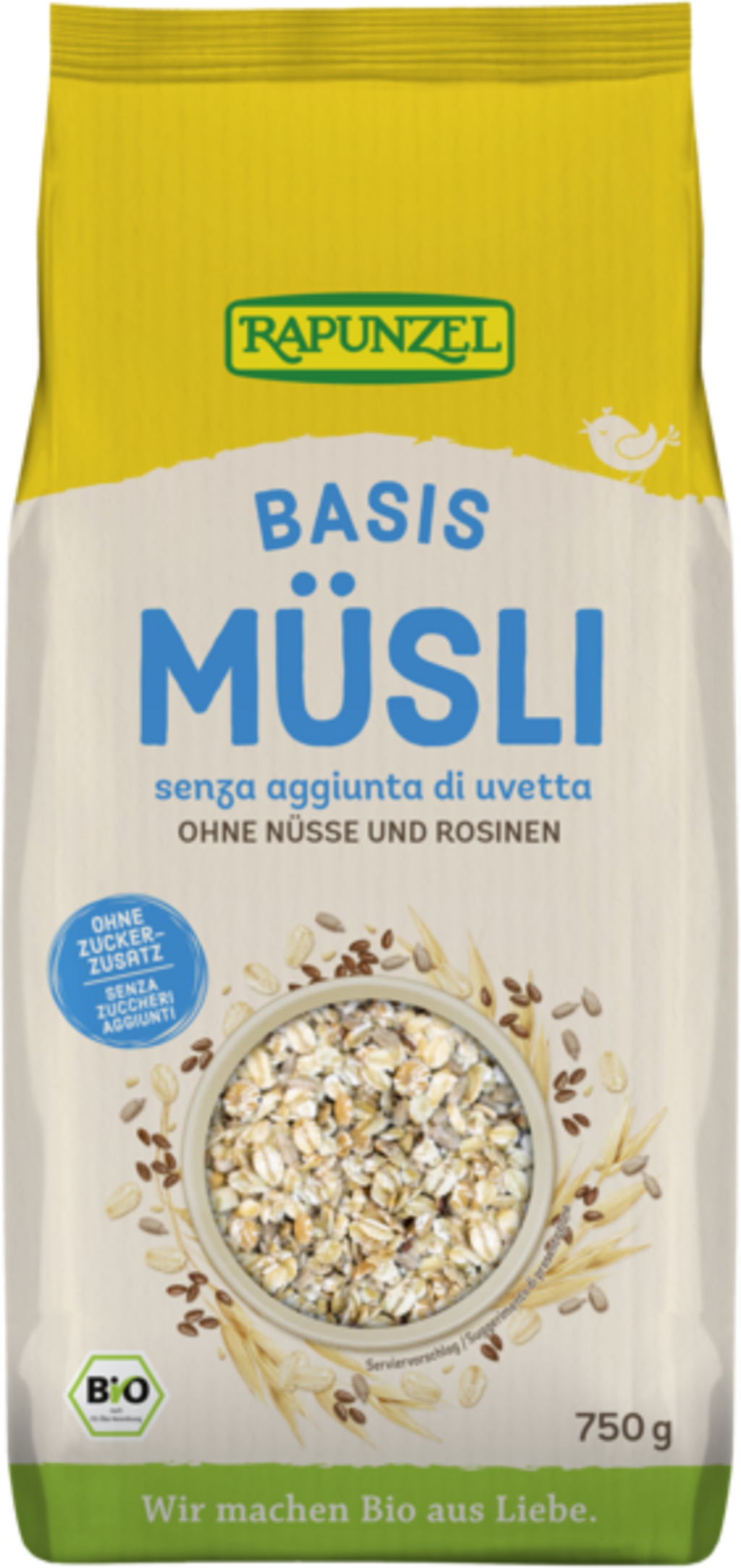 Rapunzel's basic muesli contains no nuts or dried fruit. It is perfect for those who like to prepare their own muesli mix with their choice of fresh fruit and other ingredients. It also contains no added sugar. The hearty mix of a variety of cereal flakes, flax seeds, sesame seeds and sunflower seeds give it a flavourful, wholesome taste.