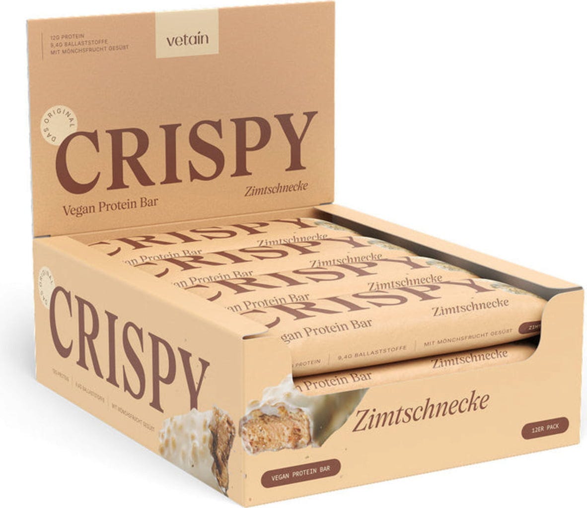 Vetain CRISPY Vegan Protein Bars, Pack of 12, Cinnamon Bun (12 bars)