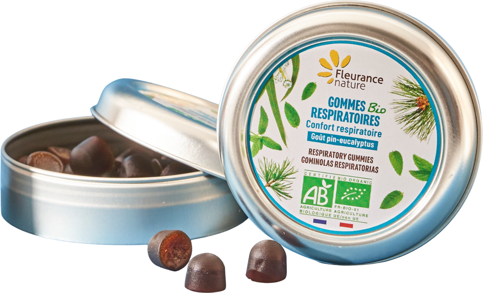 Ces gummies contiennent des huiles essentielles d’eucalyptus globulus, de menthe poivrée et de pin sylvestre, certifiées BIO et HEBBD. L’association de ces huiles essentielles renferme du menthol, de l’eucalyptol ainsi que de l’alpha- et du bêta-pinène. Leur goût frais et boisé procure une sensation de fraîcheur immédiate et intense.