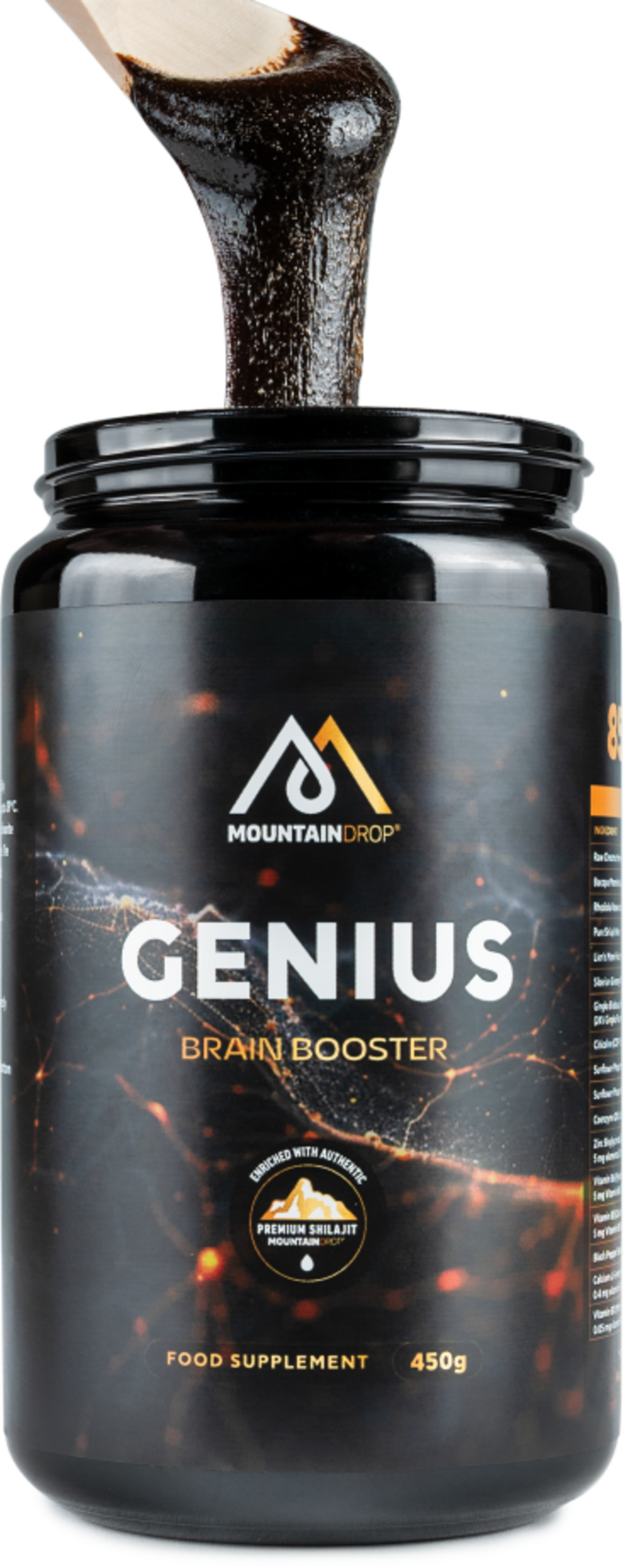 Genius de Mountaindrop repose sur un shilajit premium riche en nutriments, complété par 16 ingrédients sélectionnés. La formule associe des extraits végétaux traditionnellement appréciés à des phospholipides, au coenzyme Q10, à un complexe de vitamines B équilibré et au zinc. Le poivre noir optimise la biodisponibilité. Chaque lot de ce produit de qualité slovène est contrôlé par des laboratoires indépendants afin de garantir sa pureté et l’absence de résidus.