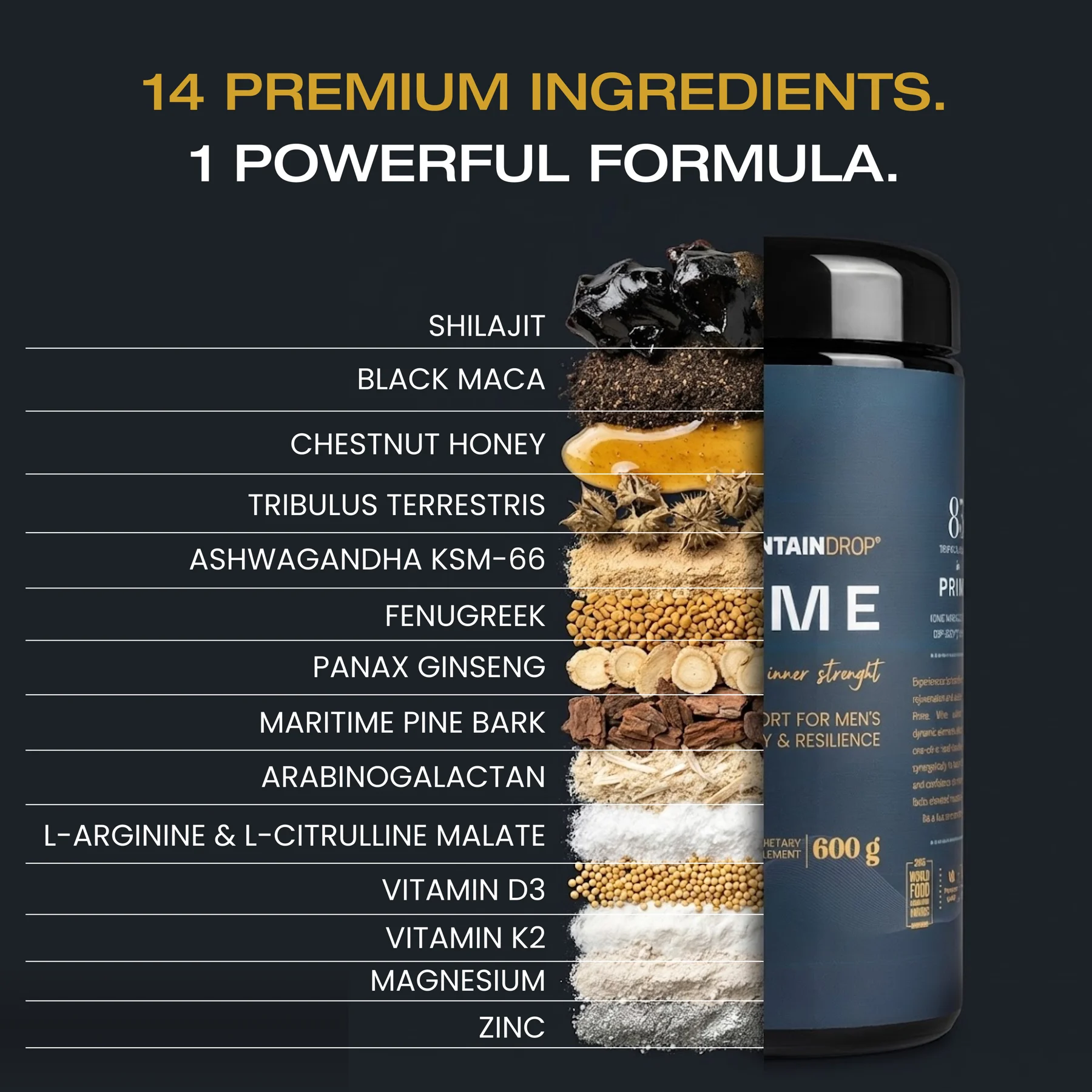 Miel de châtaignier, résine de shilajit, bisglycinate de magnésium (11 % magnésium), L-arginine, extrait de maca, Arabinogalactane, Extrait de tribule terrestre (90 % Saponine, extrait de racine d'ashwagandha KSM-66® (5 % Withanolides)), extrait de graines de fenugrec (50 % Saponine), Malate de L-citrulline, Extrait de panax ginseng (6 % Ginsénosides), Extrait de pin maritime, Zink-L-Monomerhionin (18 % Zinc), cholécalciférol,