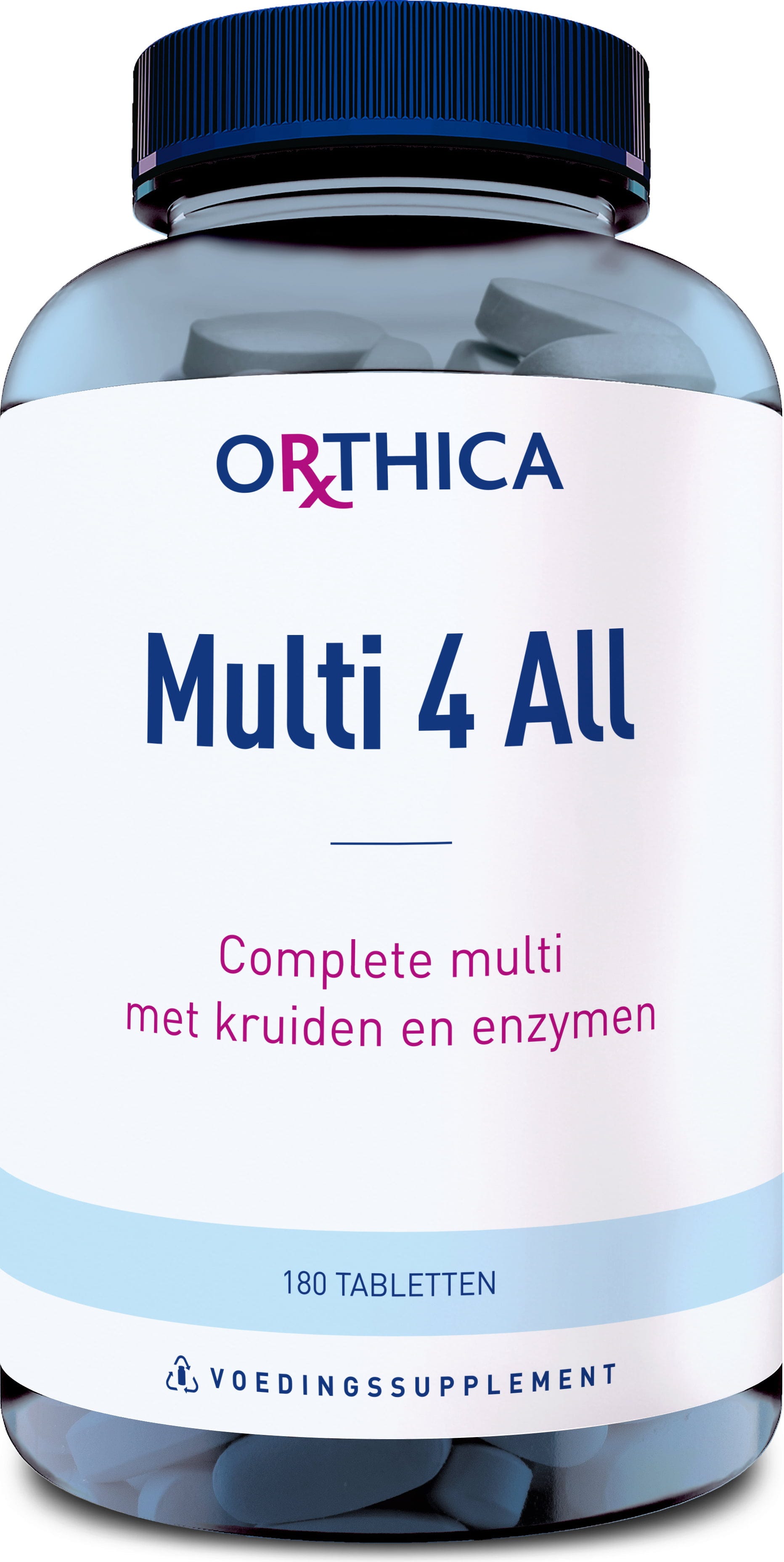 Orthica Multi 4 All est un complexe multivitaminé et minéral sous forme de comprimés, qui associe une large variété de vitamines et de minéraux essentiels à des extraits végétaux sélectionnés et à des enzymes. La formule comprend notamment les vitamines A, C, D3 et E, l’ensemble des vitamines du groupe B, ainsi que du calcium, du magnésium, du fer, du zinc, du cuivre, du sélénium, du manganèse et de l’iode. Elle est complétée par des extraits de plantes tels que la luzerne, la verge d’or, la prêle et le palmier nain, ainsi que par d’autres composants comme la papaïne et la bromélaïne. Cette composition est conçue pour compléter l’alimentation quotidienne, en particulier lorsque l’apport en nutriments par l’alimentation seule n’est pas toujours suffisant.