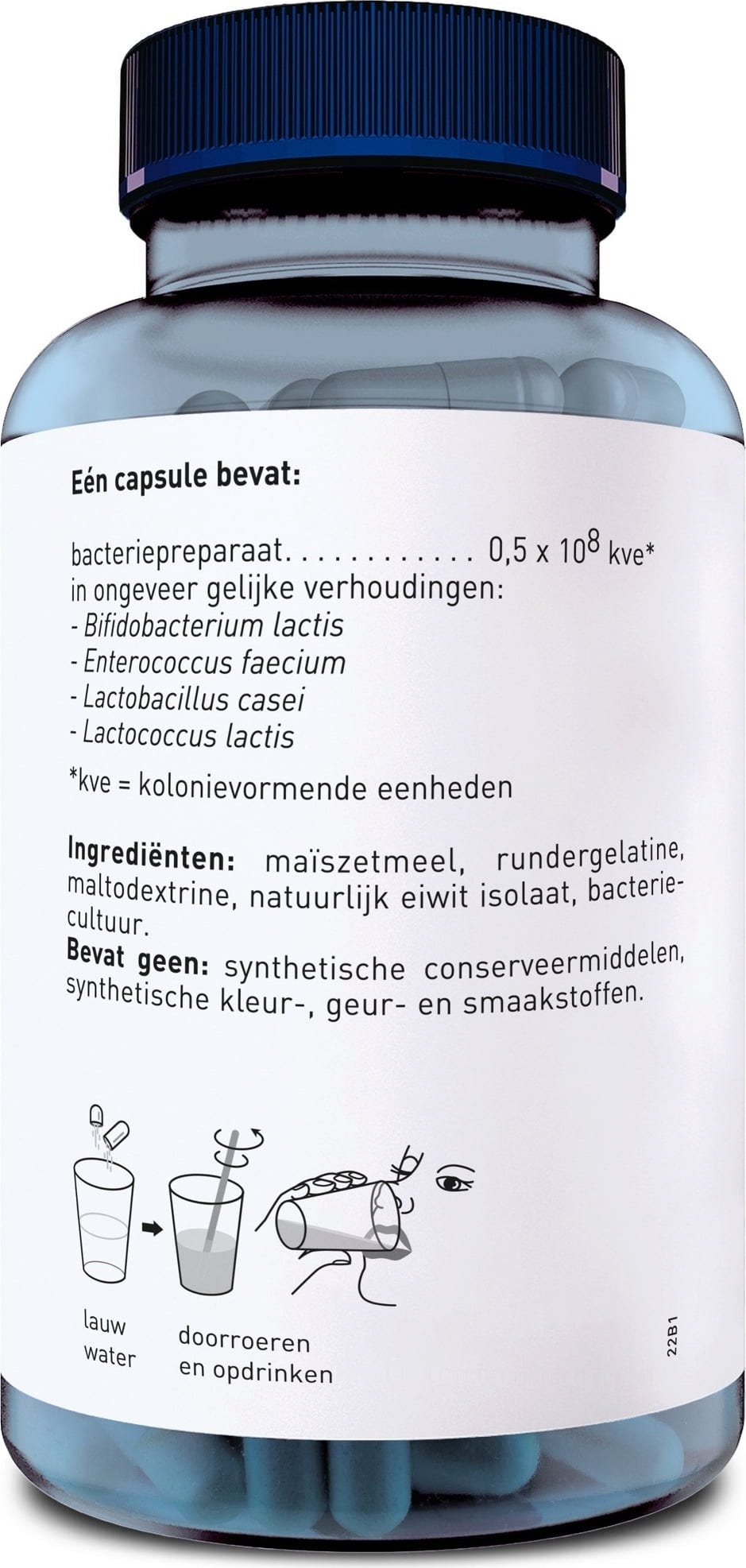 Ce produit propose une combinaison ciblée de quatre souches bactériennes différentes : Bifidobacterium lactis, Lactobacillus acidophilus, Lactobacillus paracasei et Lactococcus lactis. Chaque gélule contient ces micro-organismes dans une concentration définie, afin de compléter l’alimentation quotidienne.