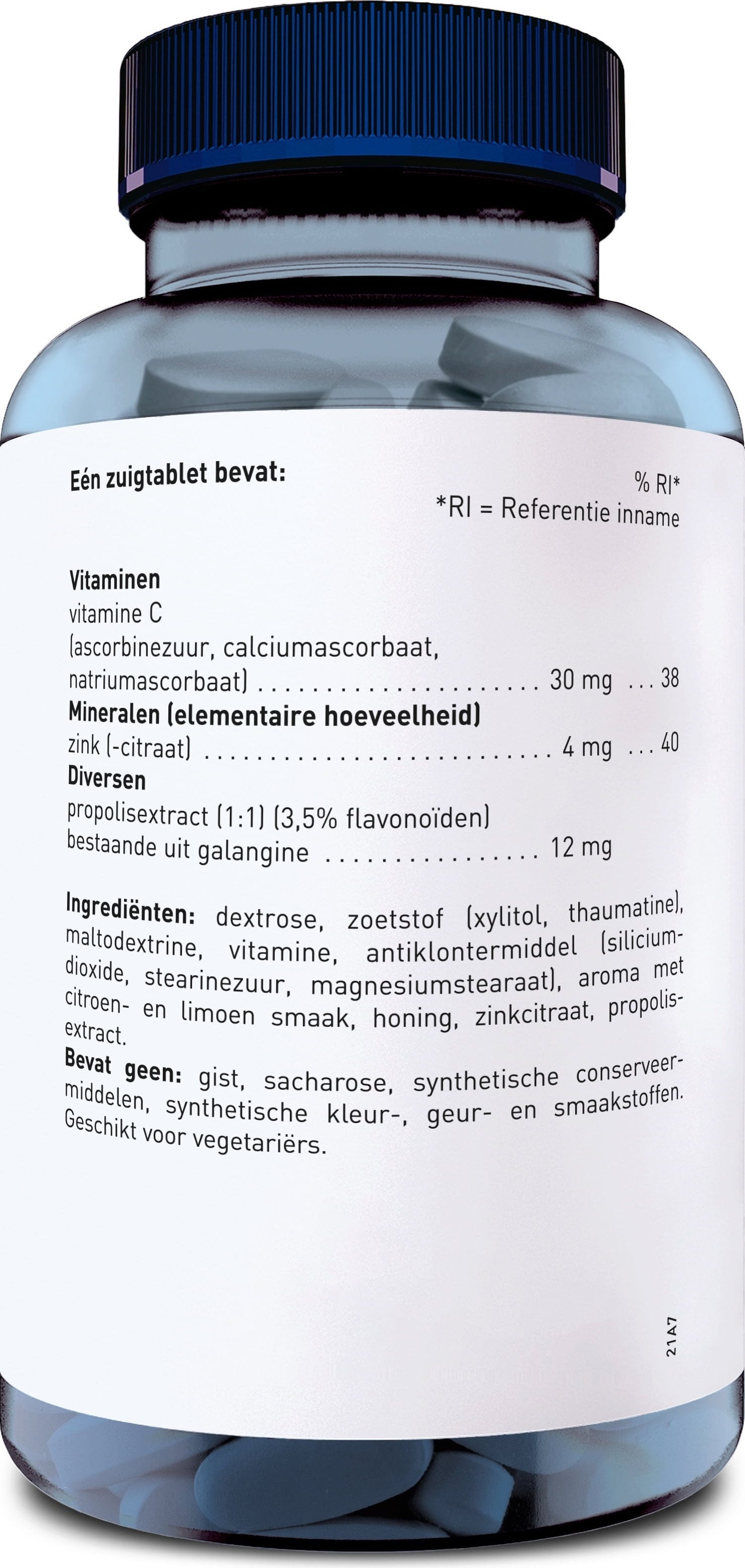 Edulcorant (Dextrose), Edulcorant (Xylitol), Maltodextrine, Vitamine C, Arômes (Arôme de citron, Arôme de citron vert), Edulcorant (Thaumatine), Miel, Extrait de propolis, Citrate de zinc, anti-agglomérant (Dioxyde de silice), anti-agglomérant (Acides gras alimentaires, Sels de magnésium d'acides gras alimentaires)