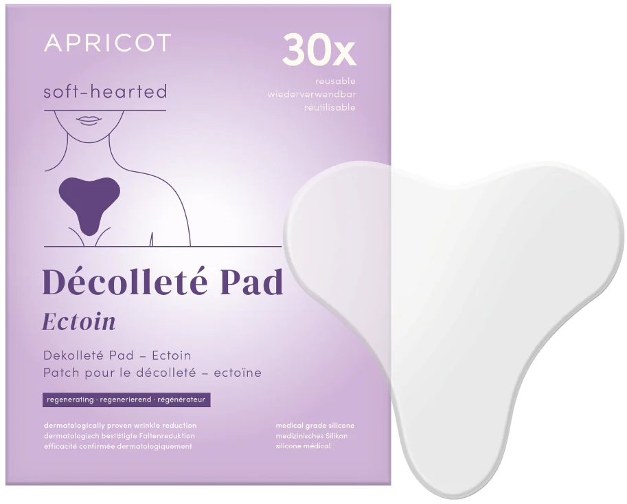 Con il pad per décolleté con Ectoin di APRICOT, puoi prenderti cura della pelle secca del décolleté. È realizzato in silicone di grado medicale e arricchito con ectoina naturale, che può levigare linee e rughe. Il pad può essere riutilizzato fino a 30 volte.