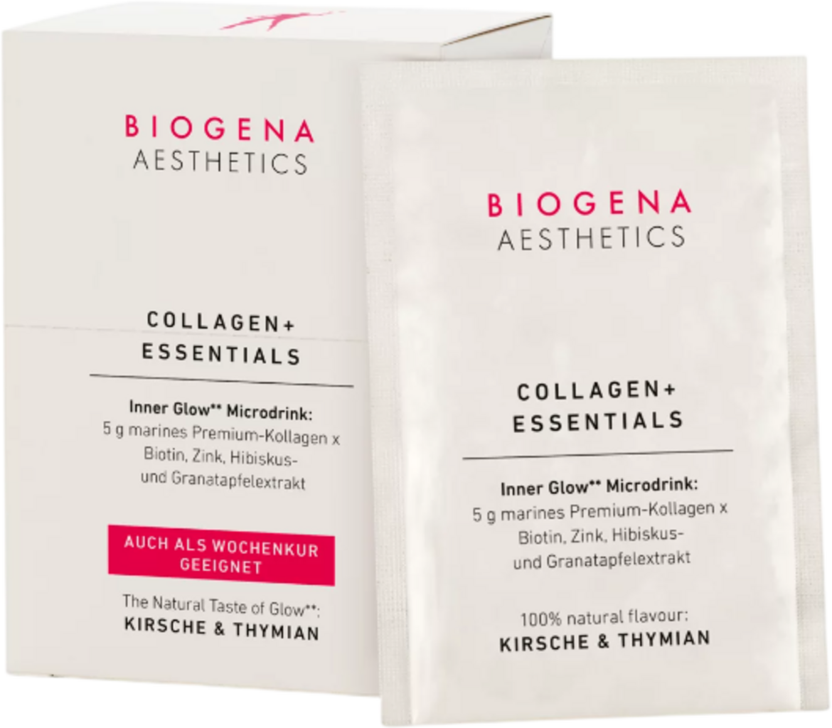 BIOGENA Collagen+ Essentials ha un rinfrescante gusto di timo-ciliegia e combina ingredienti accuratamente selezionati in una miscela di alta qualità. Il collagene NATICOL® è a base principalmente di peptidi di collagene di tipo I di origine ittica. Proviene da un'acquacoltura responsabile che supporta la tutela sostenibile delle risorse marine. Il prodotto è arricchito con biotina, zinco, estratto di melograno ed estratto di fiori di ibisco.