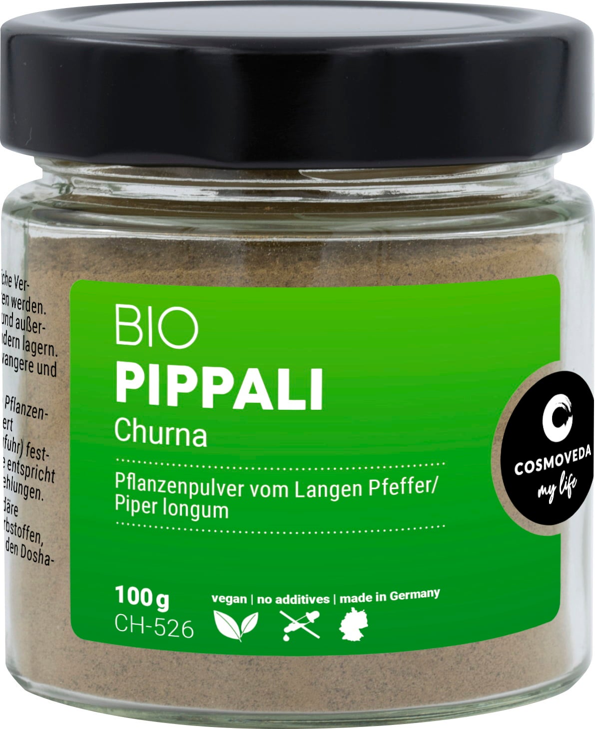Pippali - Piper longum - è conosciuto anche come pepe lungo ed è una pianta aromatica con frutti da 2,5 - 3,5 cm di lunghezza e 5 mm di spessore di colore nero-verdastro. Nella dieta ayurvedica vengono utilizzate le radici e i frutti immaturi e maturi. La produzione avviene in modo delicato e lavorato a basse temperature (inferiore a 40 °C).