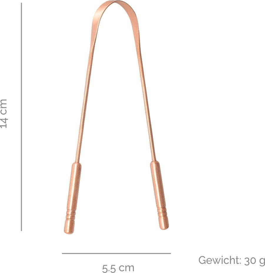 La tradizione ayurvedica della pulizia della lingua è stata a lungo considerata il complemento ideale per l'igiene orale. Il pulisci lingua combatte l'alitosi, migliora il senso del gusto e rimuove i fastidiosi depositi. Il rame puro ha proprietà antibatteriche e l'uso del prodotto aiuta ad eliminare batteri e tossine che si depositano sulla lingua durante la notte. Eliminando questo strato di sporcizia, la flora orale viene delicatamente ripristinata. Il bordo liscio e largo e l'impugnatura flessibile e comoda del pulisci lingua offrono un uso pratico ed efficace!