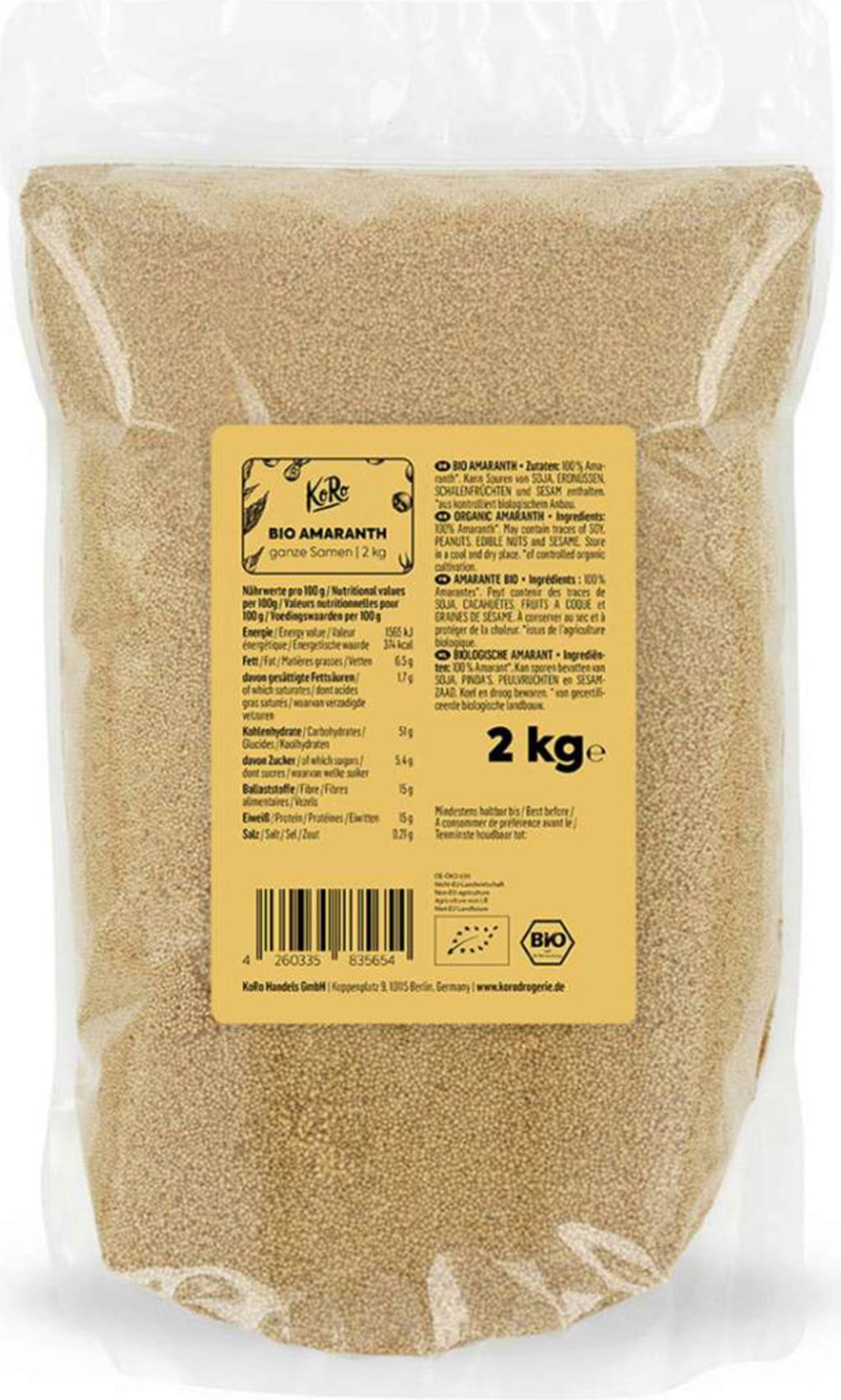 L'amaranto di KoRo è venduto in una confezione scorta da 2 kg, in modo da avere un impatto ambientale ridotto. L'amaranto è ricco di fibre e di proteine e si può utilizzare in numerose ricette, ad esempio come contorno o per preparare deliziosi sformati.