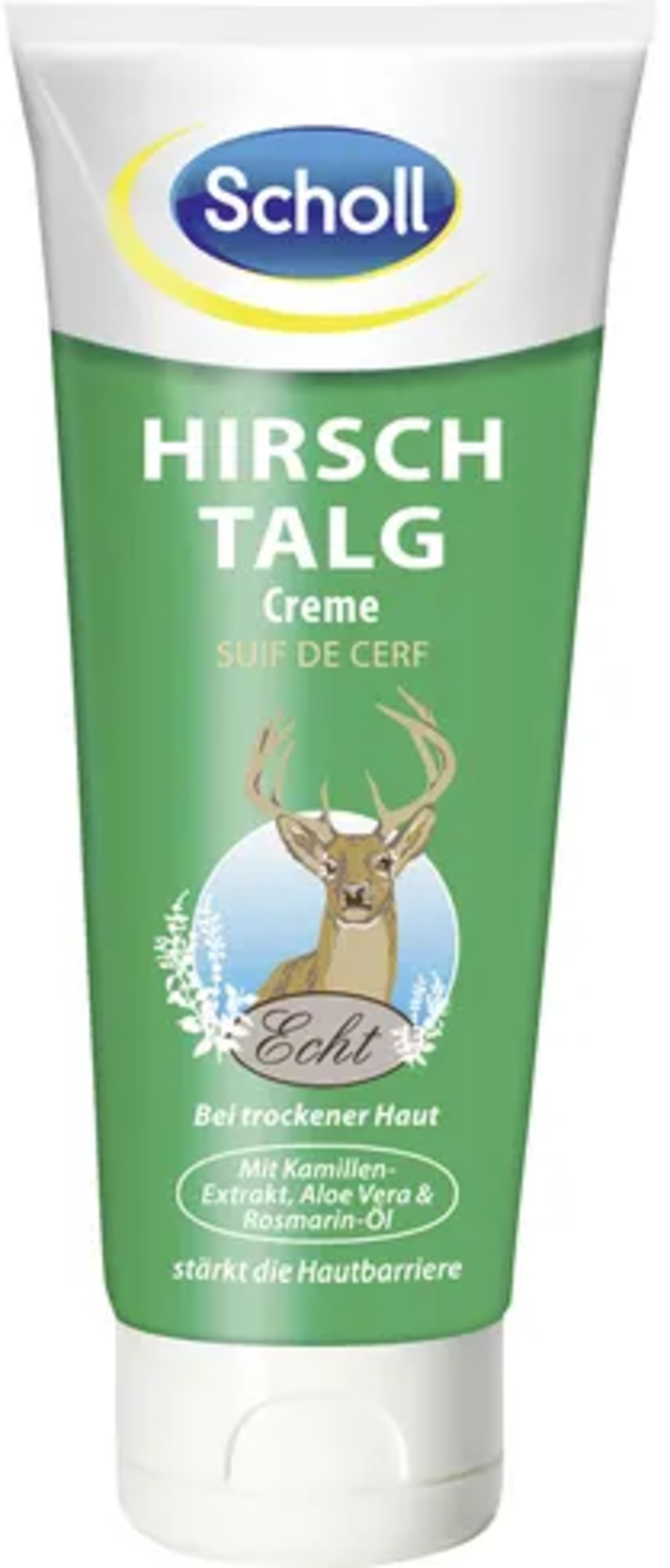 La crema al sego di cervo di Scholl nutre i tuoi piedi con estratto di camomilla, aloe vera e olio di rosmarino. La sua formula è a pH neutro e mantiene la pelle elastica a lungo. Può essere utilizzata sia sui piedi che sulle mani.