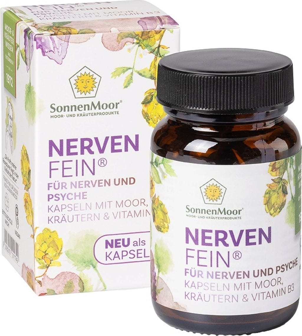 Le capsule NervenFein di SonnenMoor uniscono torba in polvere essiccata della torbiera Leopoldskron di Salisburgo a una selezione di erbe tradizionalmente apprezzate. La formula contiene un bilanciamento di foglie di melissa, luppolo e passiflora. La torba in polvere presente contiene naturalmente acidi umici e minerali come ferro, calcio e magnesio. Questa miscela vegetale è completata da vitamina B3 (niacina).